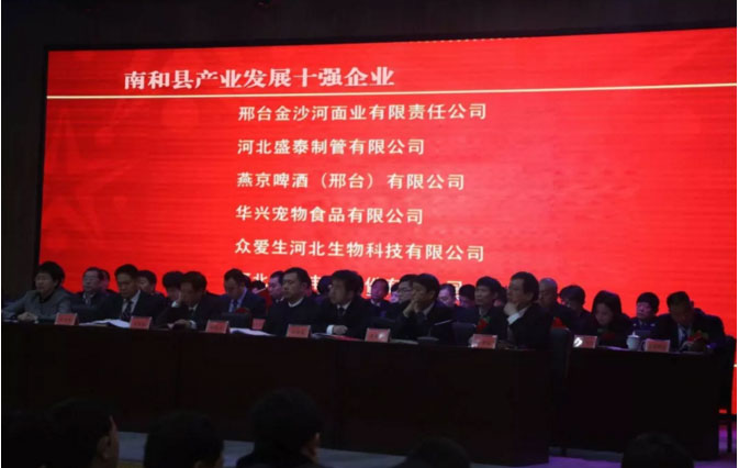 會議期間,頒發(fā)了多個獎項,各獲獎企業(yè)代表紛紛上臺領獎,縣委副書記、政府縣長韓明智同志為各企業(yè)頒獎。大會取得圓滿成功,與會企業(yè)深受鼓舞。華興寵物食品有限公司榮獲”南和縣產業(yè)發(fā)展十強企業(yè)“稱號。